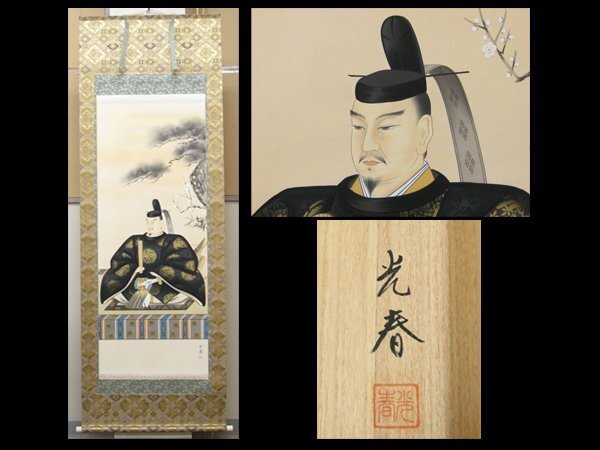 - 【心庵】掛軸 川崎光春 絹本 天神様 菅原道真/肉筆 太巻 共箱 二重箱 真作 B070