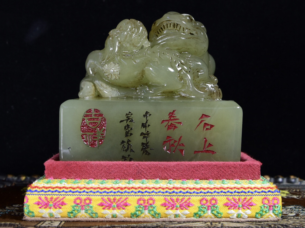 - ▽鴻▽清時代 呉昌碩銘 寿山石 田青凍石彫 瑞獣鈕印章 印鑑 共箱 時代物 中国古美術 骨董品