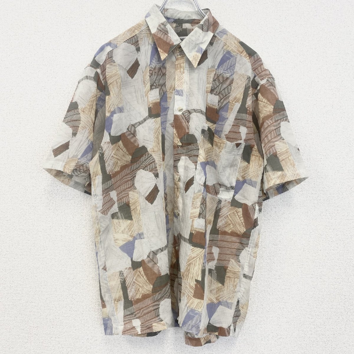 - 古着 used KINGS PRIDE 半袖プリント総柄シャツ レトロデザイン 幾何学模様 胸ポケット アート ベージュ Lサイズ