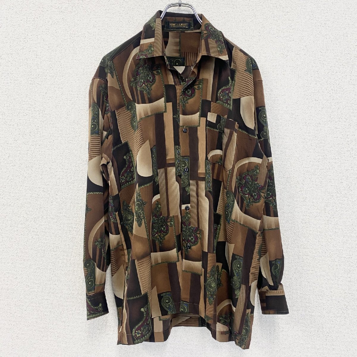 > 古着 used TORCH LIGHT 長袖柄シャツ 開襟 総柄 胸ポケット 茶色 ブラウン レトロデザイン 個性的 Mサイズ