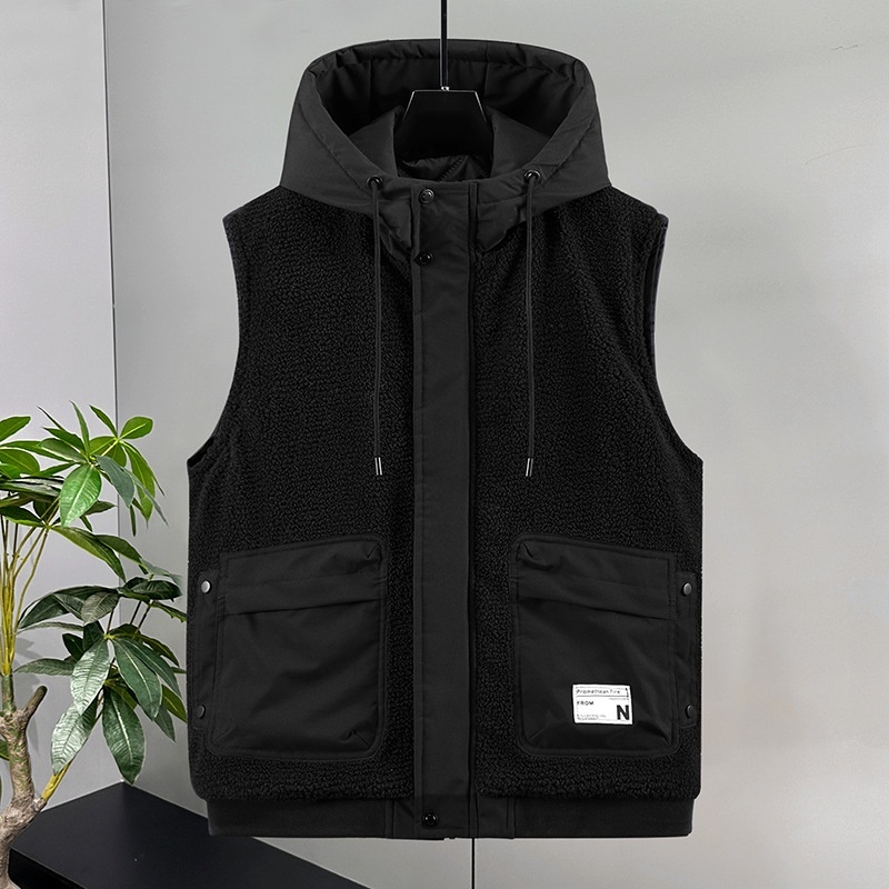 - 中綿ベスト ベスト ボア 袖なしジャケット アウター フード 新品・メンズ キャンプ トップス 切替【-2523】黒 3XL