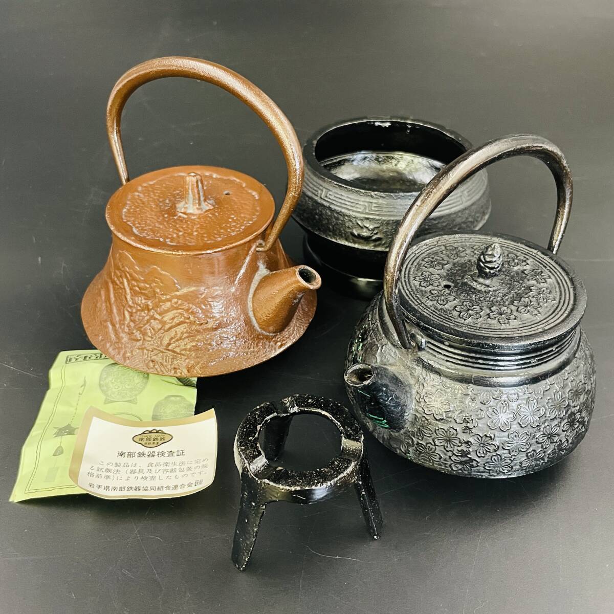 - 南部鉄器 鉄瓶 茶釜セット 急須 桜文様 台座 五徳 検査証付き 茶褐色 山水文様 急須型 茶道具
