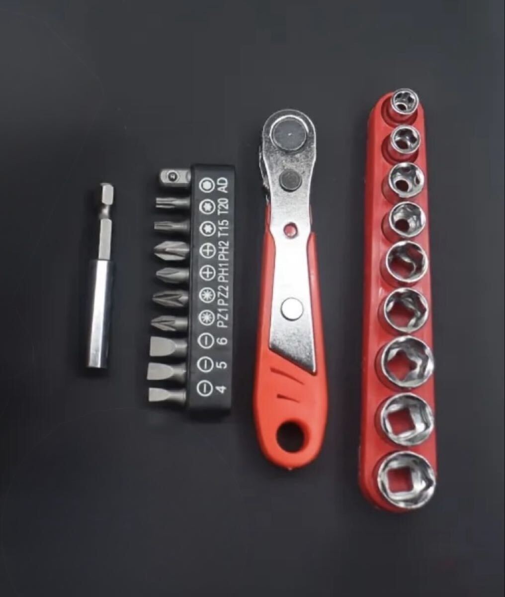 > ミニラチェットドライバーセット レンチ&ソケット型アダプター付きビット 赤ハンドルキット 隙間ドライバー 21点セット