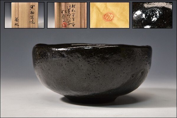 > U08262 松露亭 田部長右衛門 朋之 黒楽 黒釉 茶碗 茶道具 共箱 田部美術館 元島根県知事 /G55