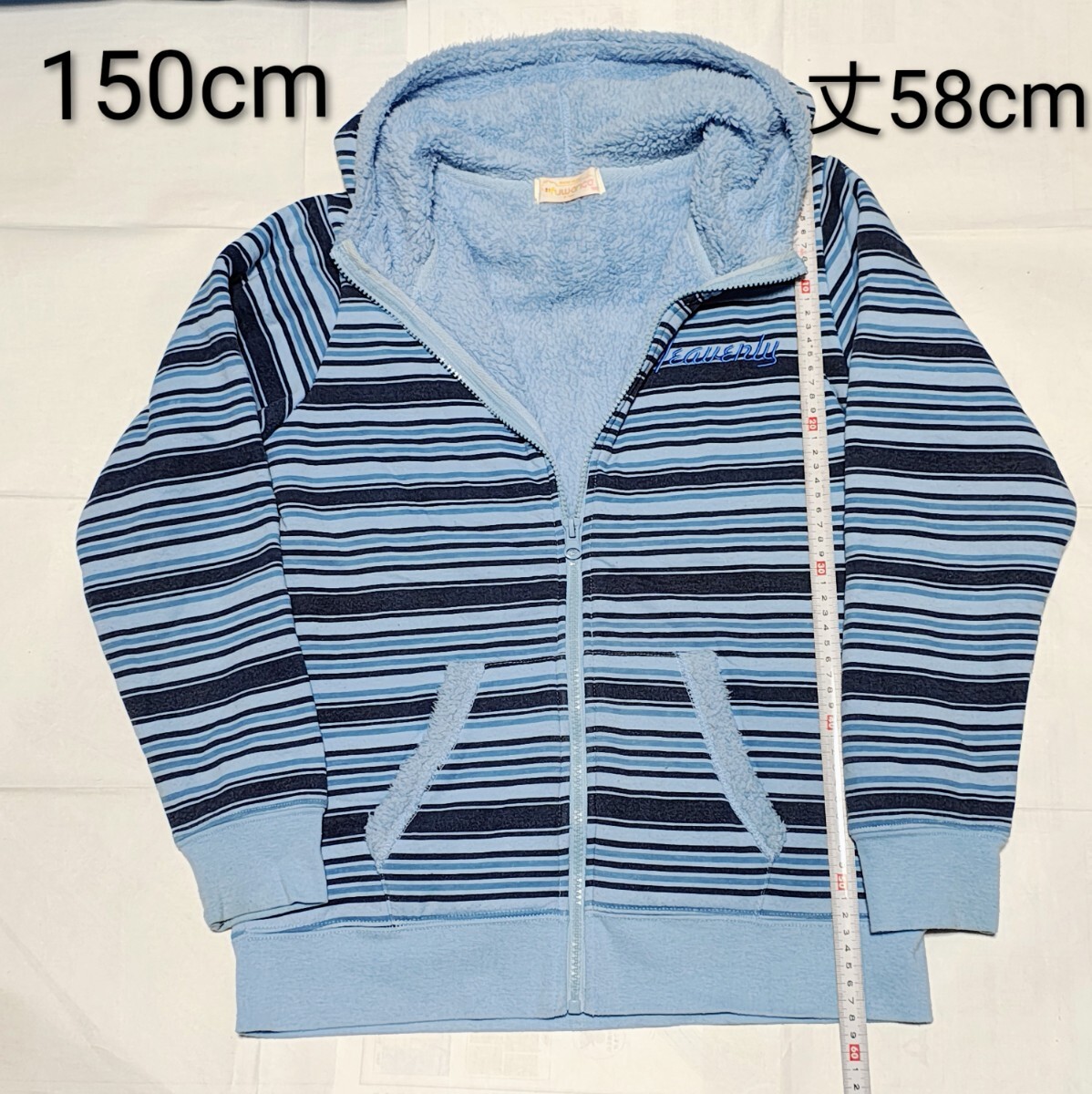 - 使用少なめ 裏全面ボア ジップアップパーカー 150cm 水色 ストライプ