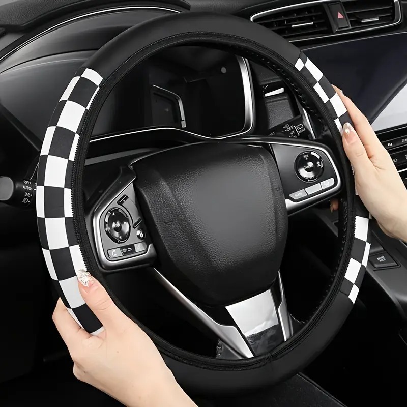 - ハンドルカバー チェッカー ブロックチェック 柄 ステアリングカバー ステアリング ホイール カバー 車載 ドレスアップ 白黒
