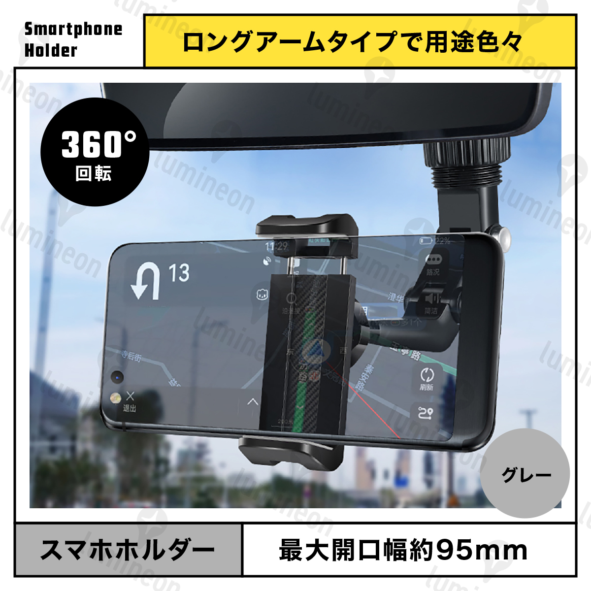 - スマホ ホルダー 車載 車用 アーム 式 360度 iPhone 携帯 固定 ナビ 回転 ワンタッチ 車 横置き 横向き マウント 挟む クリップ g101a 1