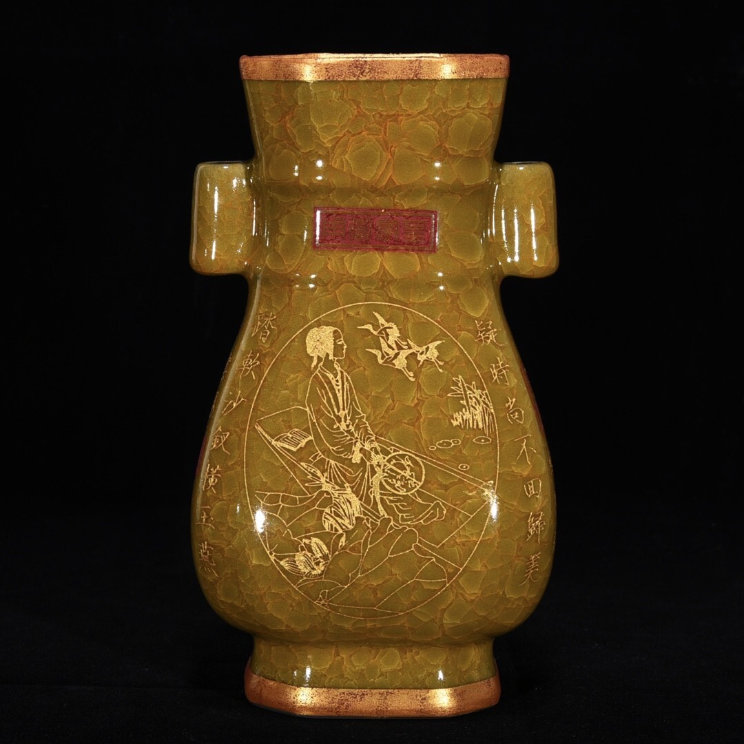 - 【永】宋時代 官窯 黄釉冰裂紋 金包口銘文塗金 仕女貫耳瓶 古陶磁器 陶芸 皿 中国陶瓷器 唐瓷 置物擺件 古美術品 古賞物 旧家蔵出 中国唐物