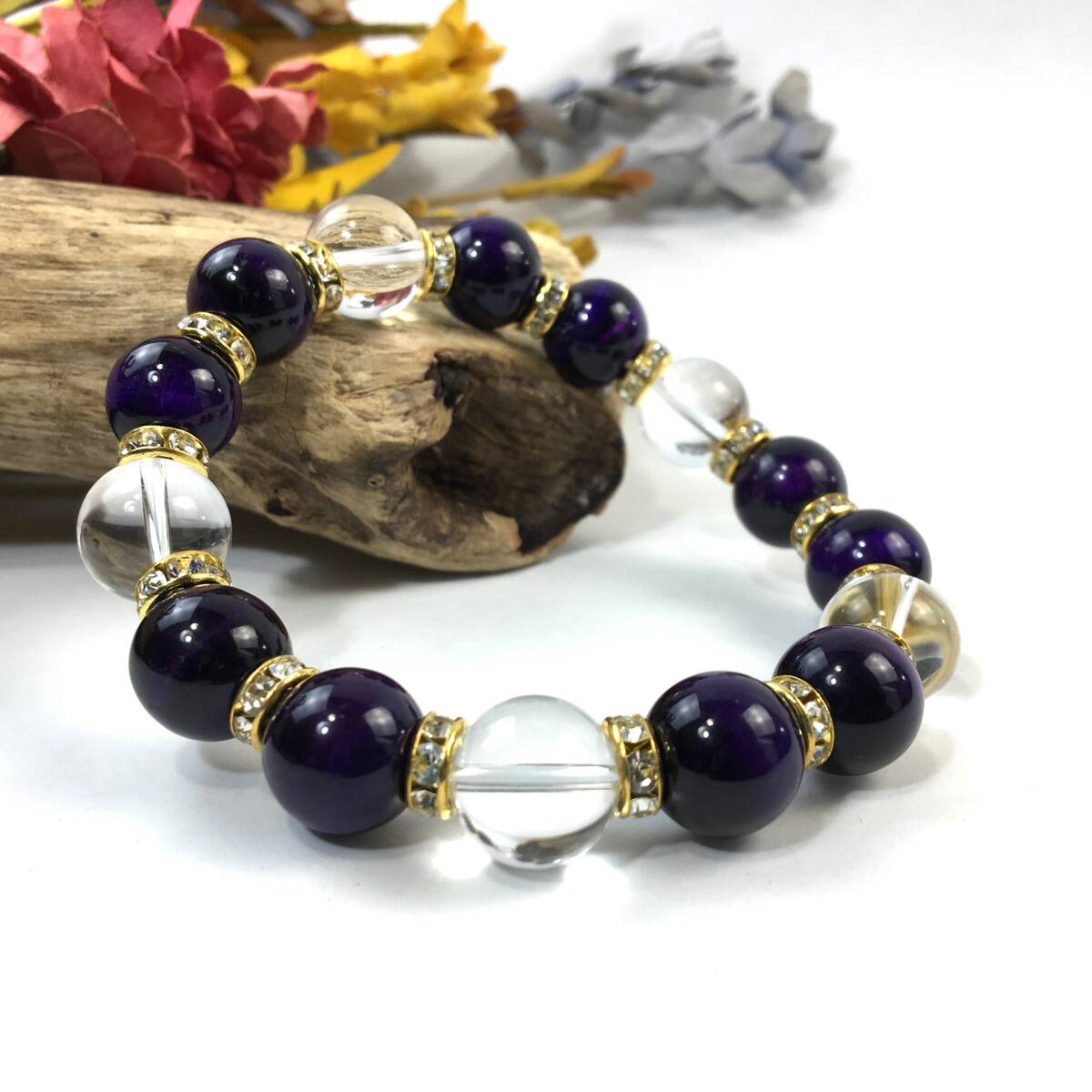 - パープルタイガーアイ&水晶 パワーストーン ブレスレット 天然石ブレス (ゴールド) 12mm 幸運 開運 メンズ 男性♪