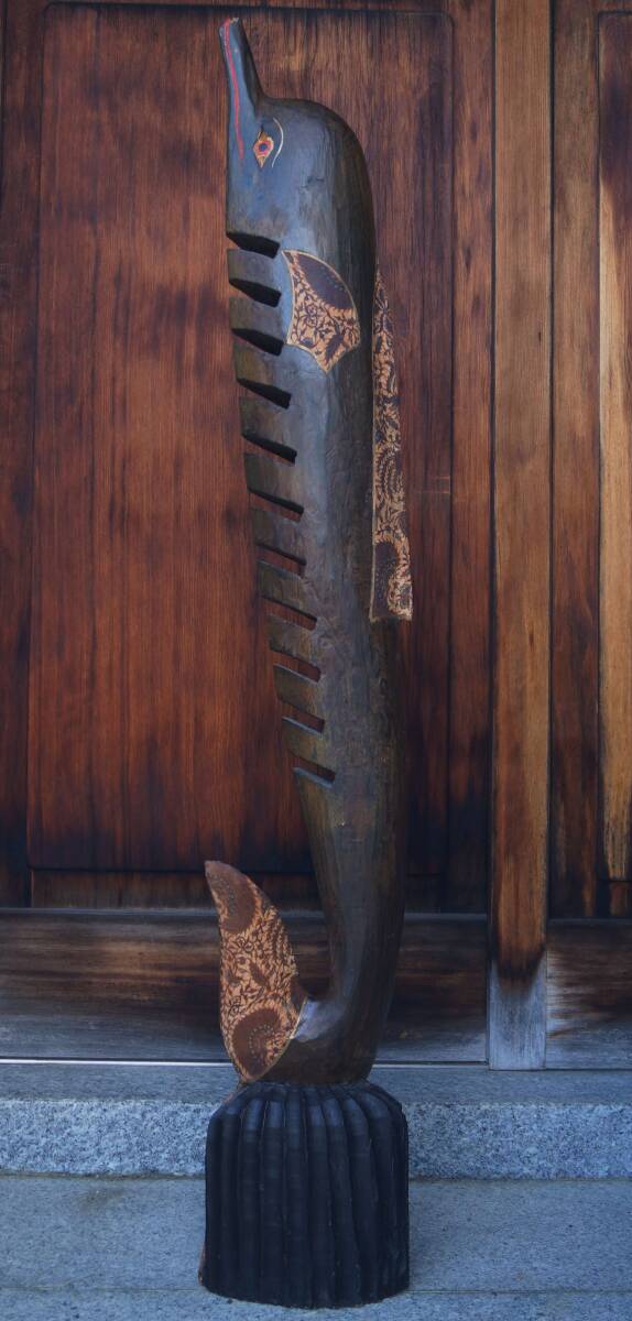 - 【閑】民俗バリ島 職人作品 木製一刀彫り 大型『イルカ』オブジェ 置物 花模様更紗装飾 高さ147.5cm 時代物★希少品★7D1021