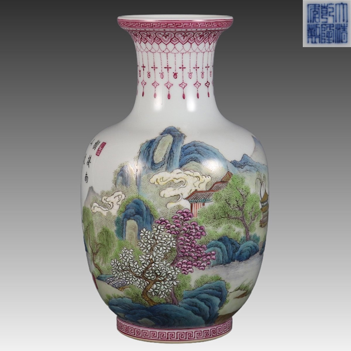 - 大成美術■粉彩山水楼閣図題詩賞瓶 清乾隆年製款 (検) 清時代 染付 陶磁器 唐物 中国美術 骨董 古玩 276