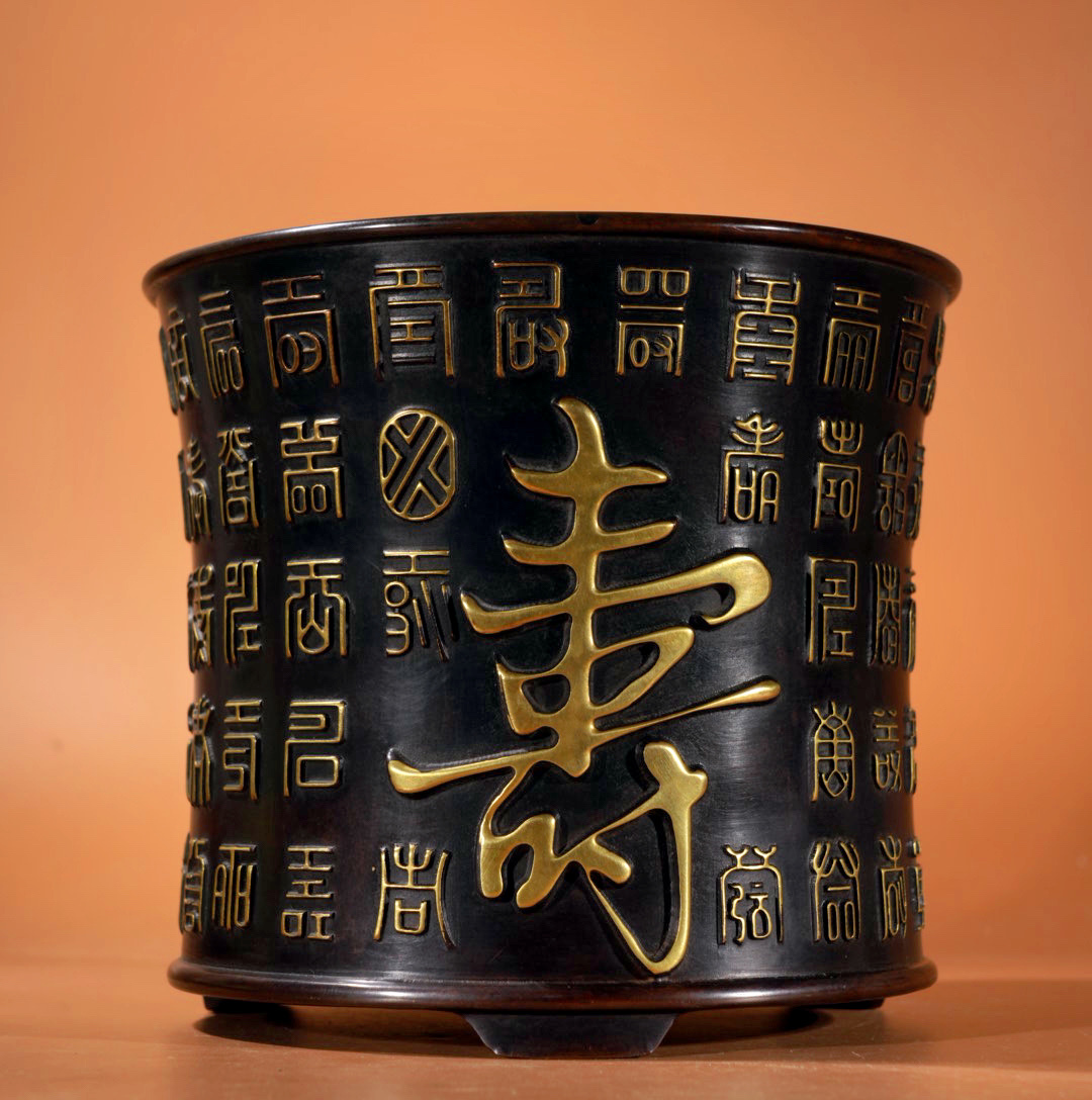 - 【超珍館蔵】紫銅製 浮彫 塗金 百壽紋 筆筒 置物 賞物 古賞物 古董品 古美術品 時代物 旧家蔵出 稀少珍蔵品