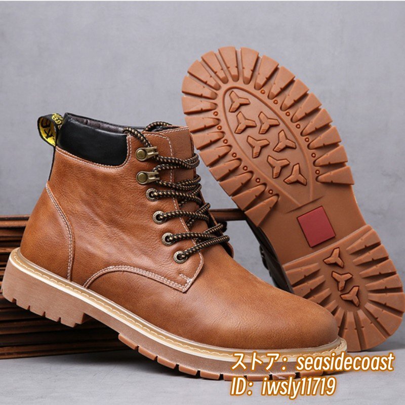 - ショートブーツ メンズ ブーツ 秋新品 マーティンブーツ 本革 レザーシューズ 牛革 ハイカット 作業靴 レースアップ 三色 ブラウン 27.0cm