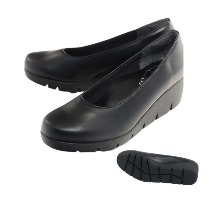 - 痛くない柔らかストレッチ 23.0 濡れに強い耐水素材 FIRST CONTACT 39600 黒 日本製 婦人 レディース ウエッジソール プレーン パンプス