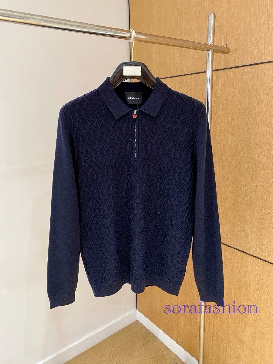> KITON キトン メンズニットポロシャツ 長袖T-シャツ トップス ネイビー 54サイズ 紳士服 ジャガード柄 通気吸湿 紳士服 コットン 柔らか