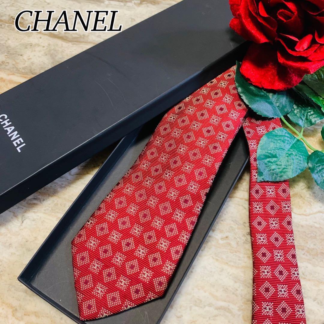 - N269 美品 シャネル ココマーク刺繍 総柄 赤系 ネクタイ メンズ
