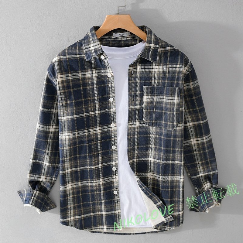 > ☆新品メンズ チェック柄長袖シャツ 春トップス ワイシャツ トレンド コットンシャツ 胸ポケット付き カジュアル アウターM~3XL選択 紺