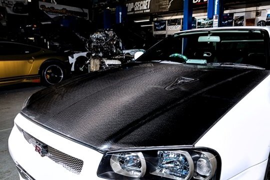- 「トップシークレット」スカイライン(BNR34)GT-R用エアロボンネット(ドライカーボン)