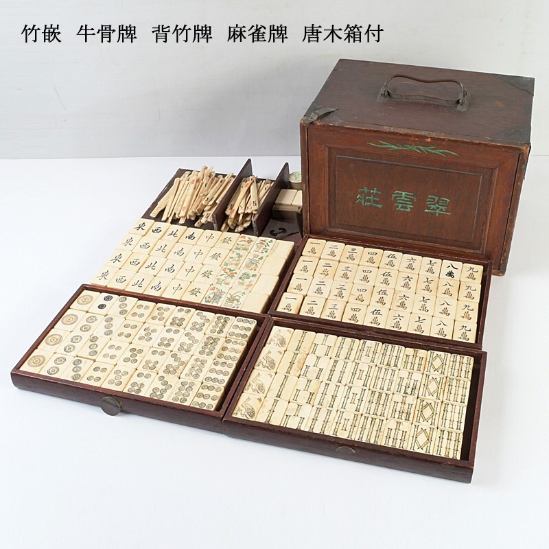 - 中国美術 竹嵌 牛骨牌 背竹牌 麻雀牌 唐木箱付 古玩 IEOT