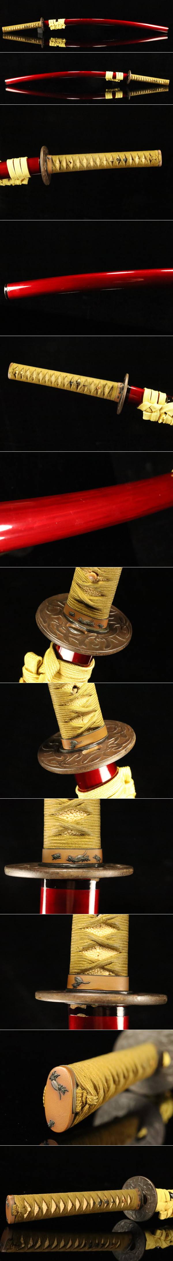 > 【ASAHI】春明法眼の幻の初期作縁頭付日本刀拵 朱塗鞘 鉄地鍔 素銅地赤銅象嵌虫図縁頭 外装 極上品[71048yp]