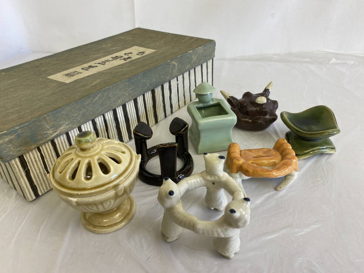- 加藤五陶 色変 七種蓋置 紙箱 茶道具 茶器 ふた置き 蟹 唐子 栄螺 火舎 陶器