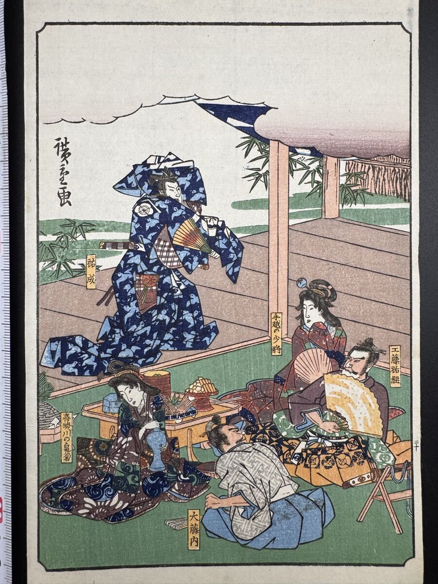 - 【真作】本物浮世絵木版画 歌川広重「曽我物語 討入りの画間」江戸期 武者絵 美人図 錦絵 中判 保存良い
