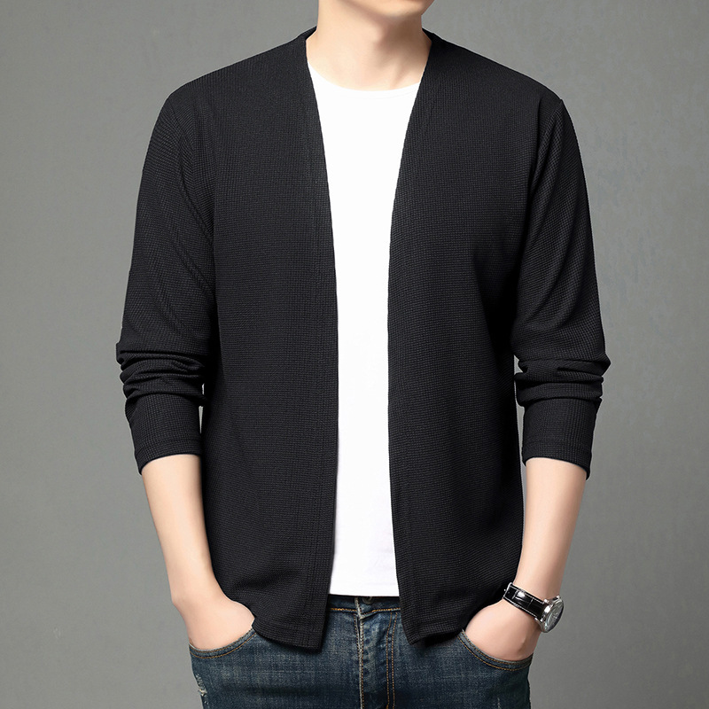 - 新品★カーディガン メンズ ニット セーター 薄手 羽織り 長袖 柔らかい ビジネス カジュアル ノーカラージャケット ストレッチ ブラックL