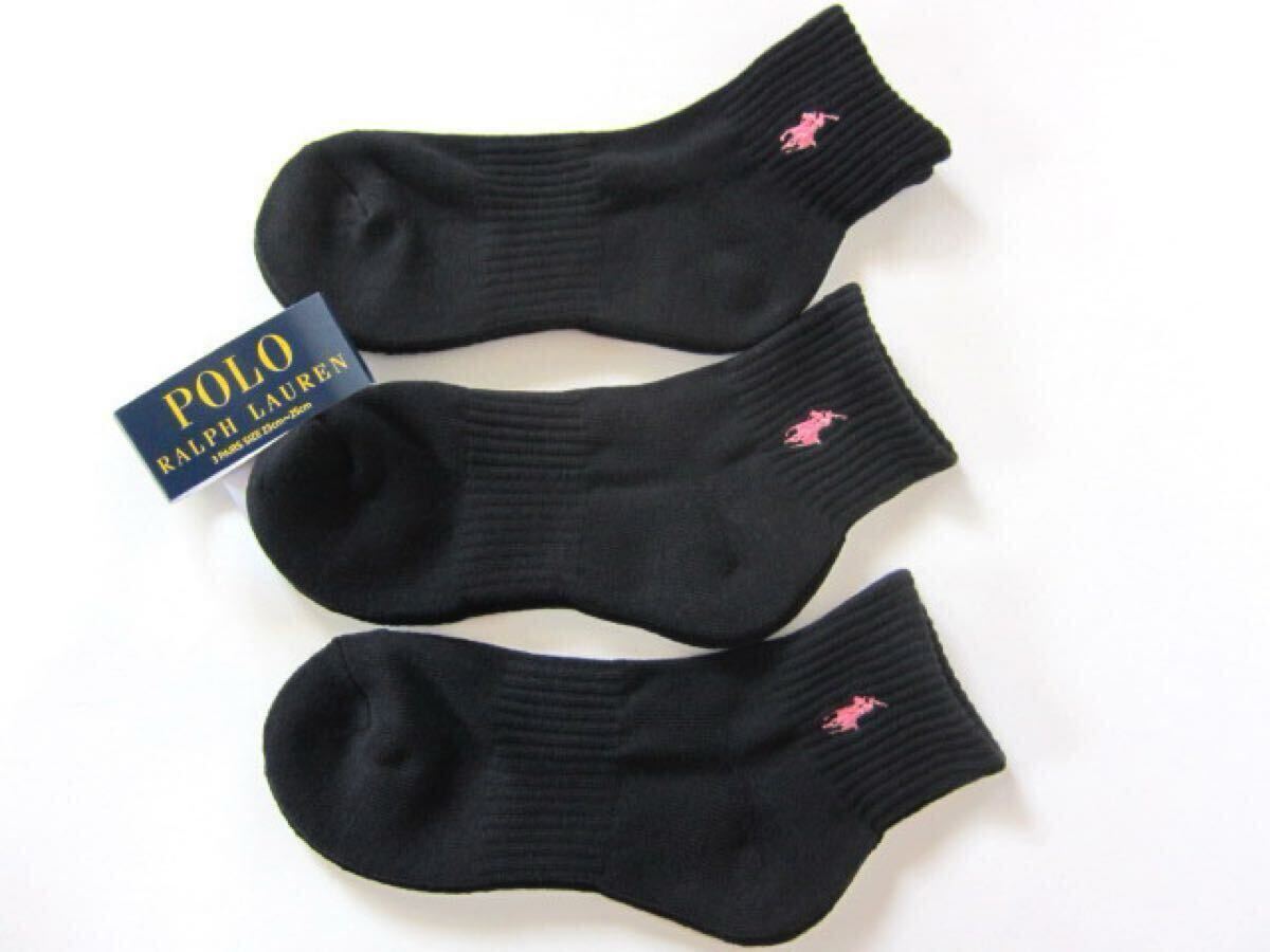 - POLO ラルフローレン新品!3足セット マーク刺繍クォーターソックス 23-25cm黒PK 送料無料 RALPHLAUREN靴下