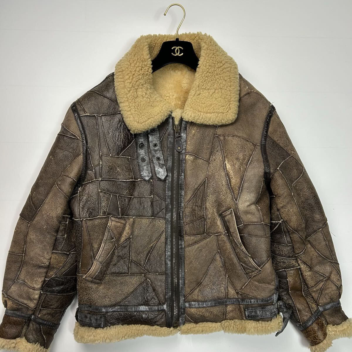 - 希少★ Lサイズ B-3 フライトジャケット ムートンジャケット ラムレザー ツギハギ クラスト加工 パッチワーク レザージャケット 本革 羊