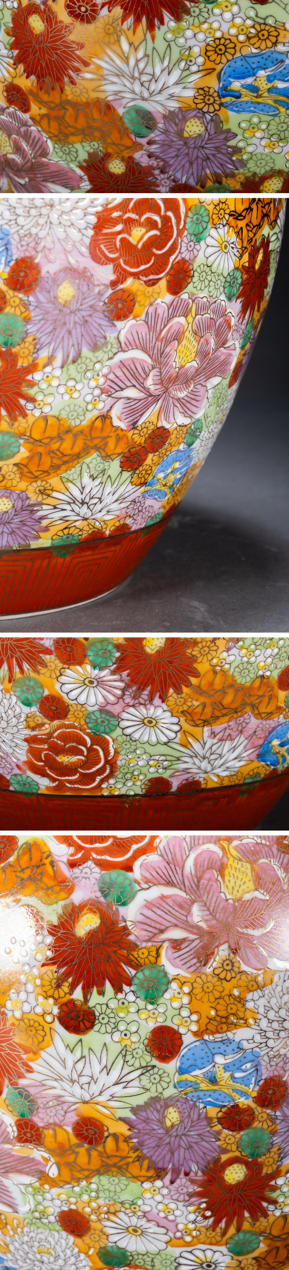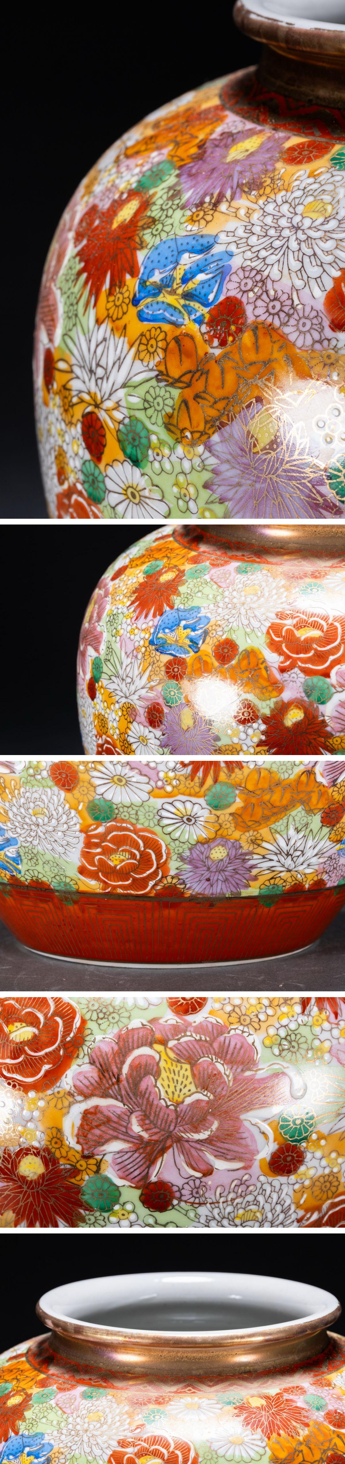 - 【珍品堂】1円から OS14-V05 九谷焼 春洋 作 金彩 色絵 百花詰 花詰 花瓶 高25cm 壺 共箱 木箱 飾壺 時代物 骨董品 古美術