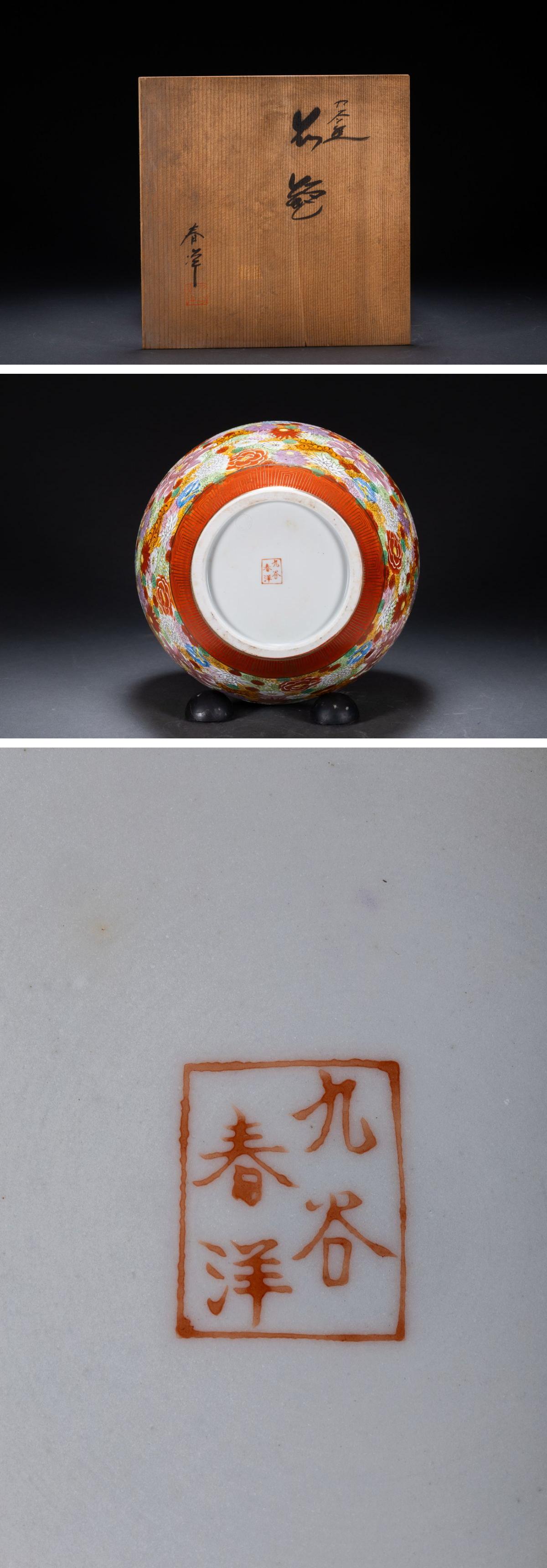 > 【珍品堂】1円から OS14-V05 九谷焼 春洋 作 金彩 色絵 百花詰 花詰 花瓶 高25cm 壺 共箱 木箱 飾壺 時代物 骨董品 古美術