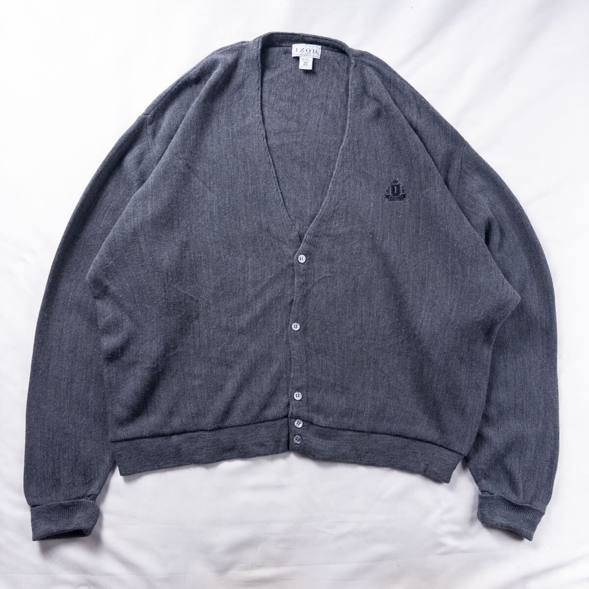 > US Vintage アメリカ製 90s IZOD アイゾッド アクリル 刺繍 ロゴ クラシック トラッド カジュアル レトロ プレーン グレー カーディガン