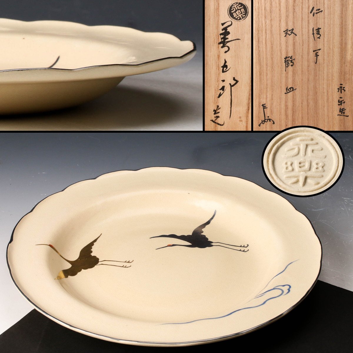 > 【佳香】十六代 永楽善五郎(即全) 仁清写双鶴皿 表千家十三代即中斎(無盡宗左)書付箱 本物保証