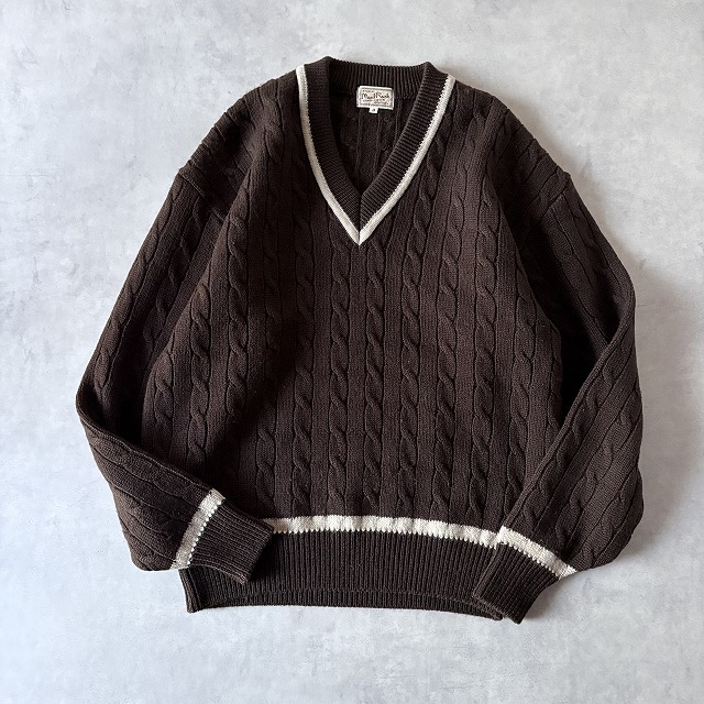 - Maul Ruck TAKEO KIKUCHI モールラック タケオキクチ ミドルゲージ ウール100% ケーブル編み Vネック ニット チルデンセーター (3) e-006