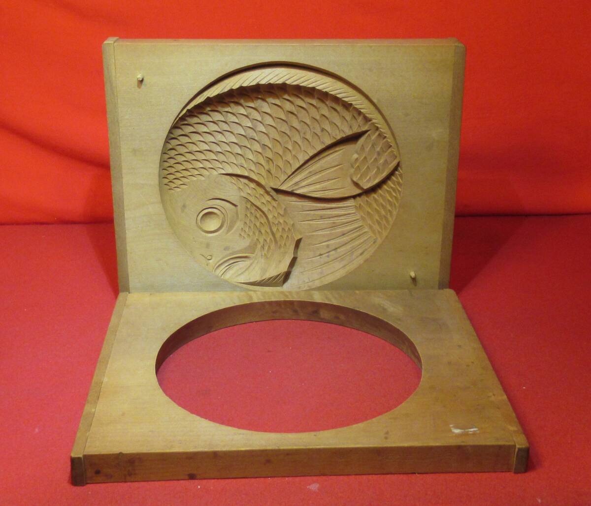 - 『古い木製菓子型「鯛 タイ」④丸形 細密(27、3×21、6㎝)』和菓子 古道具 アンティーク 木彫 民芸 落雁 木型 民藝 古民具 日本料理 和食
