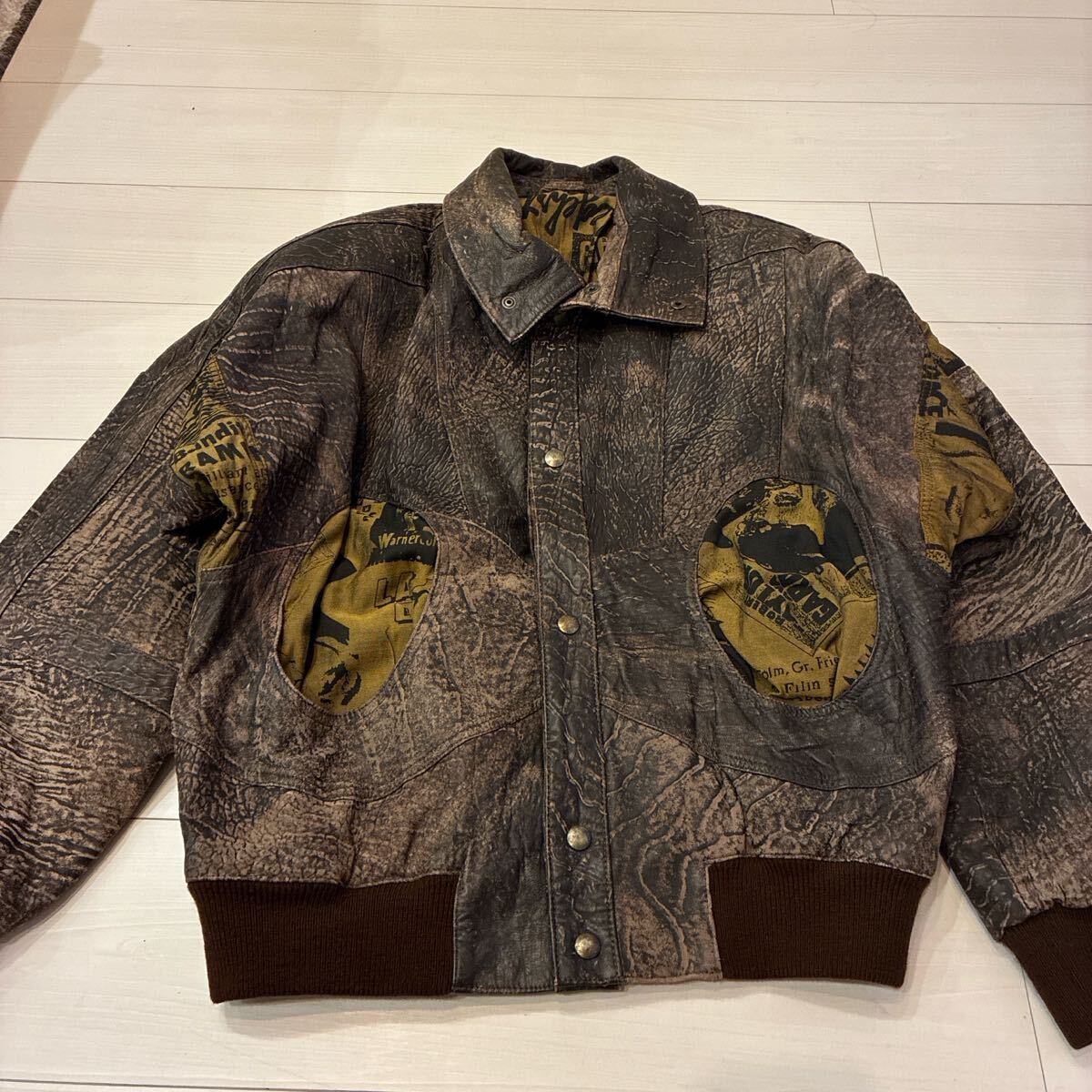 > ヴィンテージ レザージャケット 総柄 切替 太アーム ブラウン ボンバー ブルゾン 古着 アウター 本革 ミリタリー