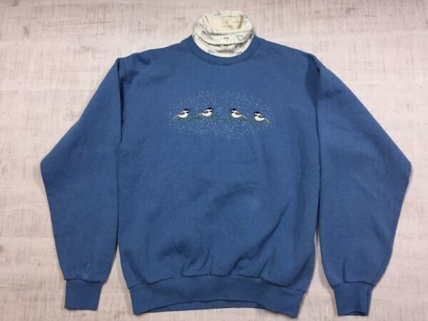> USA製 Artisans オールド レトロ 90s 古着 スーベニア 小鳥 刺繍 タートルネック スウェット トレーナー レディース レイヤード M 紺