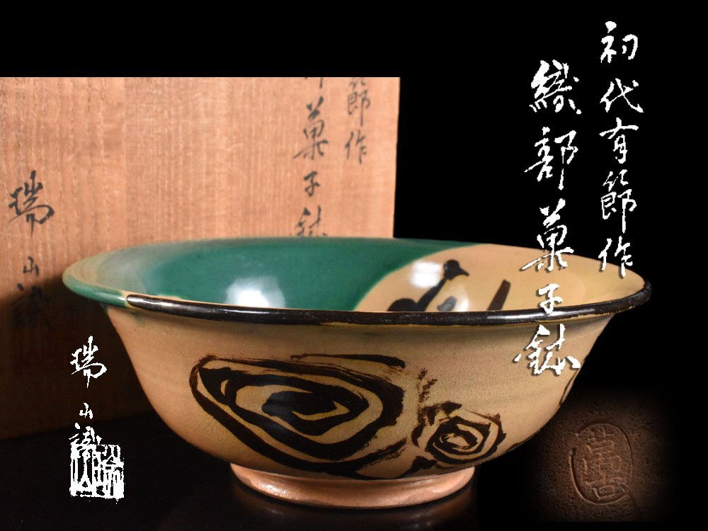 - 【雲】某資産家買取品 萬古名人 初代 有節造 織部写し菓子鉢 直径18.5cm 加賀瑞山識箱 古美術品(菓子器)BY5678 OTgfr