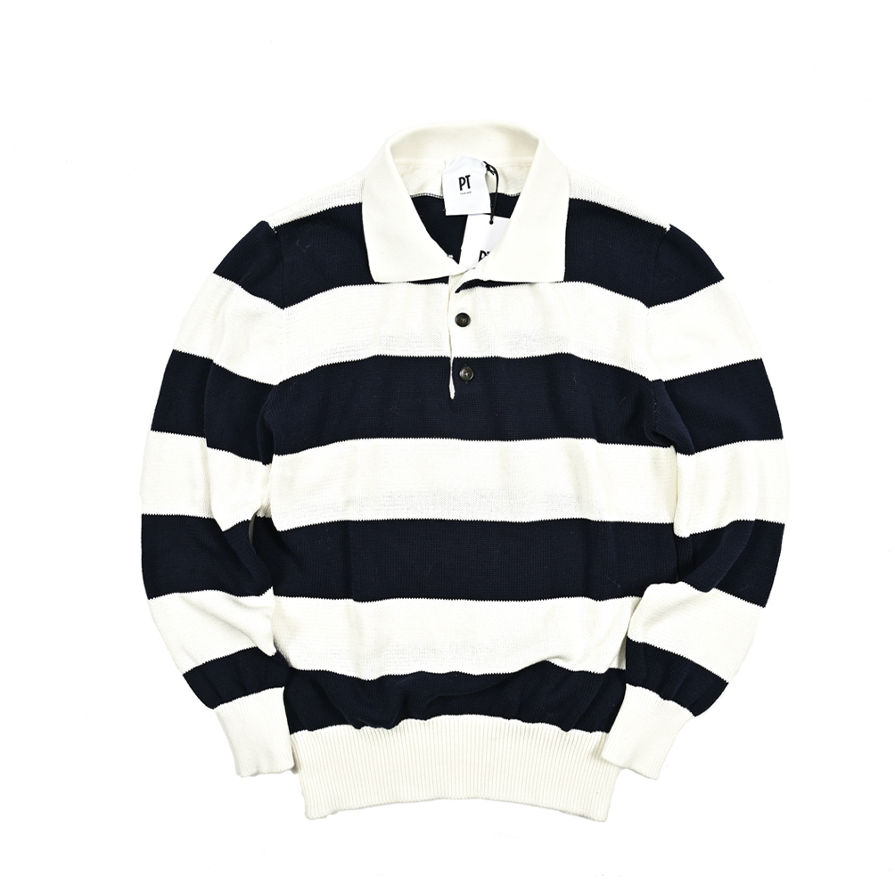 > 秋冬新入荷 新品 ピーティートリノ PT TORINO ニットポロシャツ ワイドカラー 長袖 メンズ コットン ボーダー ホワイト ネイビー 412964