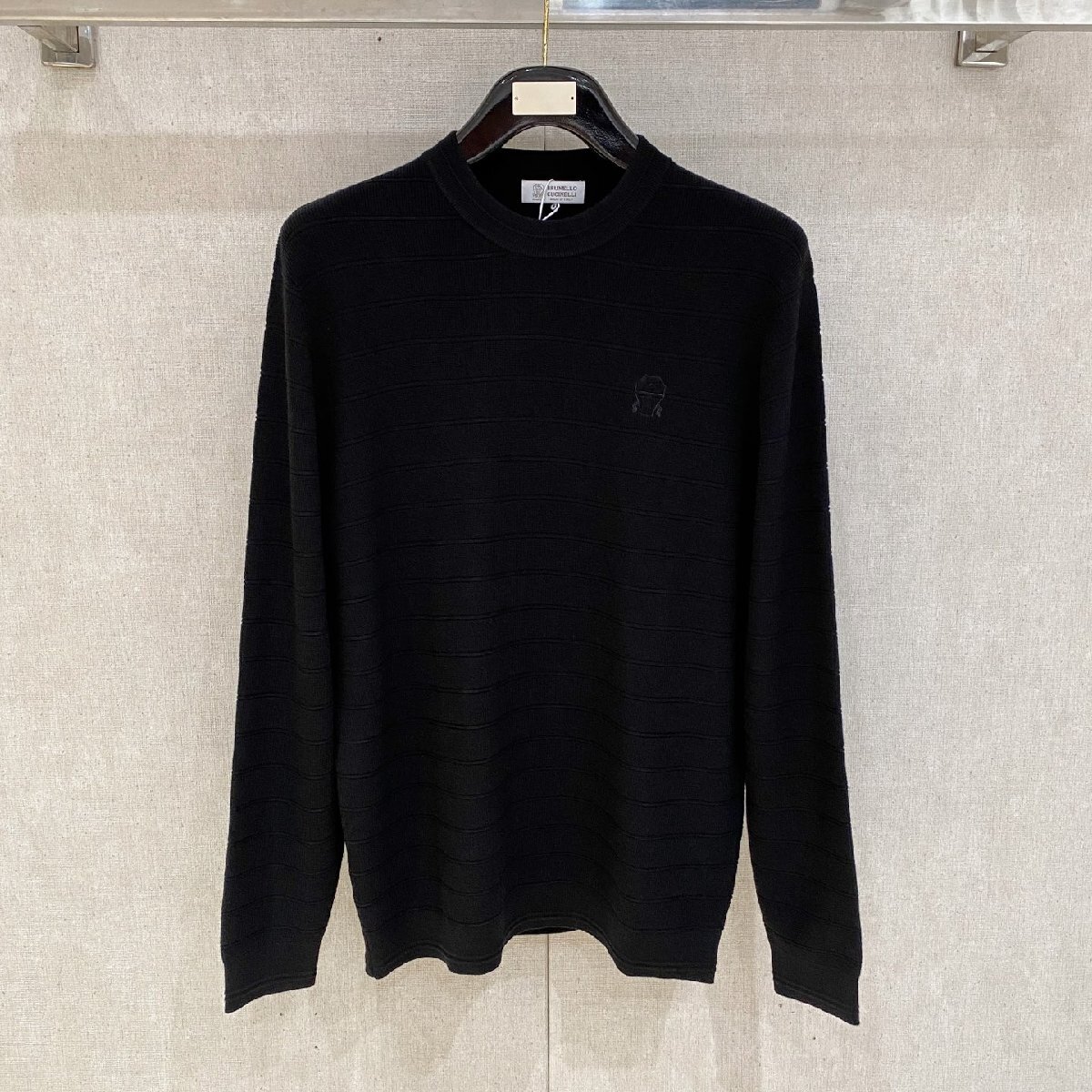 > ブラックM★送料無料★ブルネロクチネリ★メンズ リブニット セーター,ウール混, クルーネック, ストライプパターン, カジュアル