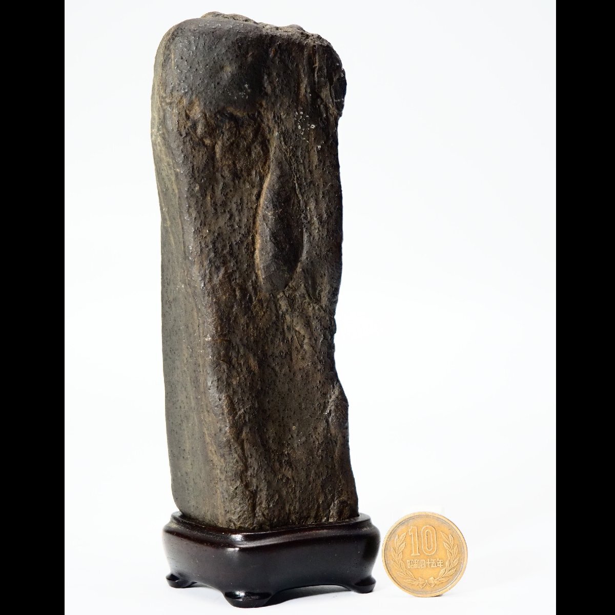 - 【治】自然石天然石 盆石置物☆唐木台座付 台込高さ 15.5cm (検索:水石 奇石 盆景 盆石 盆栽 岩石 飾石 鉱石 観賞石 古い 時代) RJ087