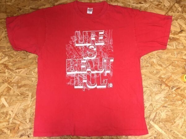 - 灯油 とうゆ Life Is Beautiful らいふいずびゅーてぃふる たみ。 半袖ロゴTシャツ アニソン キャラクター XXL 赤 メンズ