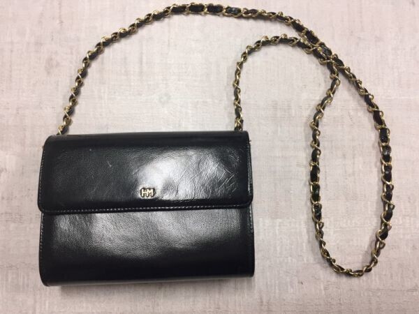 - ハナエモリ HANAE MORI レトロ オールド オケージョン パテント レザー チェーン バッグ ポシェット レディース 黒