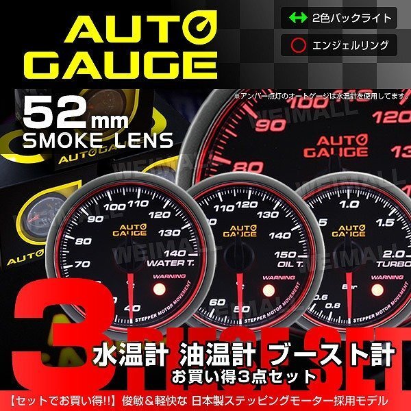 - 【3点セット 水温計/油温計/ブースト計】オートゲージ 52mm 52Φ 458 追加メーター 計器 スモークレンズ エンジェルリング 日本製モーター