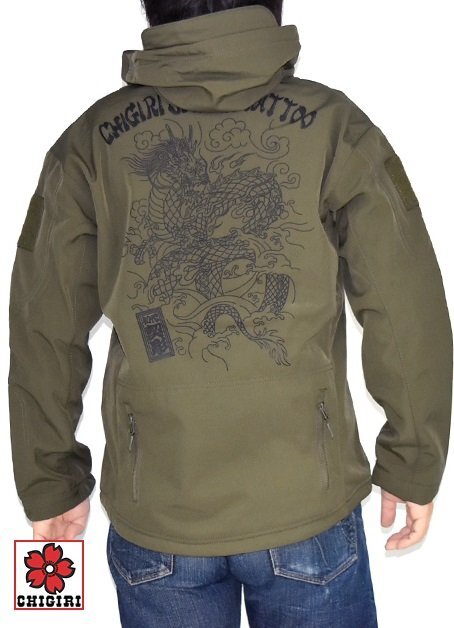 - 筋彫り龍 裏フリースソフトシェルジャケット◆CHIGIRI カーキ Lサイズ CHL64-1481 ちぎり チギリ 和柄 和風 竜 ドラゴン アウター