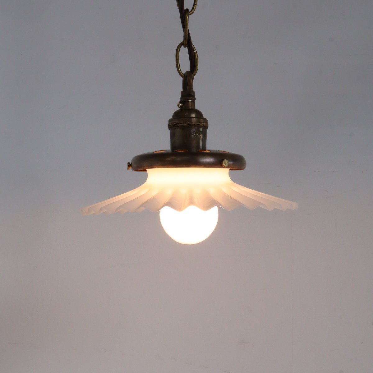 > 30s~40s フリルシェード ペンダントランプ/アールデコ ミルクガラス アンティーク 吊り下げランプ 照明 ランプ#705-5-113-410