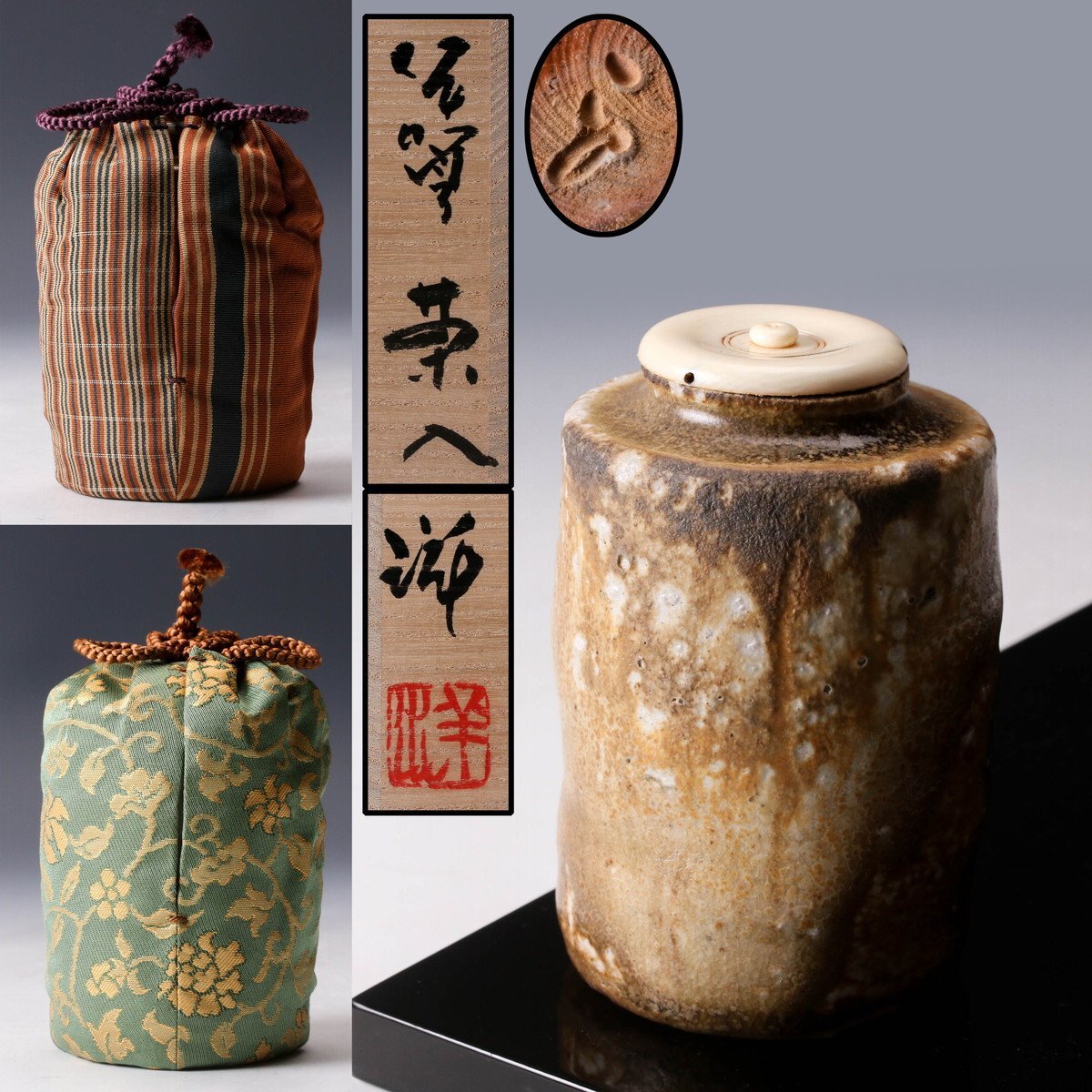 【佳香】谷本洋 伊賀茶入 共箱 仕覆(弥左衛門間道) 替仕覆(東山金欄) 栞 茶道具 本物保証