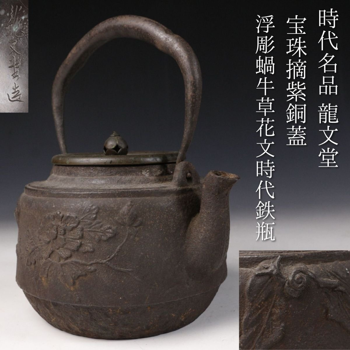 - 【LIG】コレクター放出品 時代名品 龍文堂 宝珠摘紫銅蓋 浮彫蝸牛草花文 時代鉄瓶 茶道具 古美術品[.EP]25.05