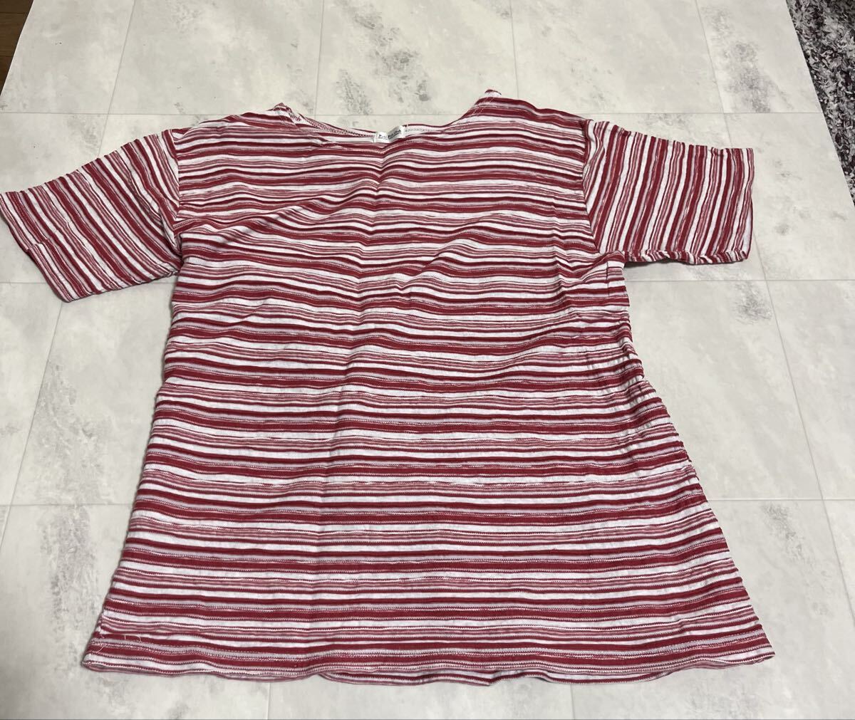 - 織素材 半袖Tシャツ ボーダー柄 赤系