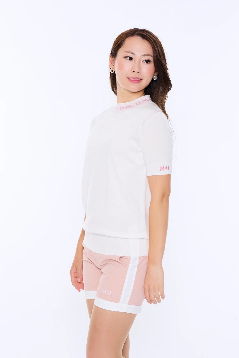 > MU スポーツ 801H2256 ホワイト サイズ42 ロゴジャガード襟半袖ニット 定価14,300円 ミエコウエサコ 新品 レディス
